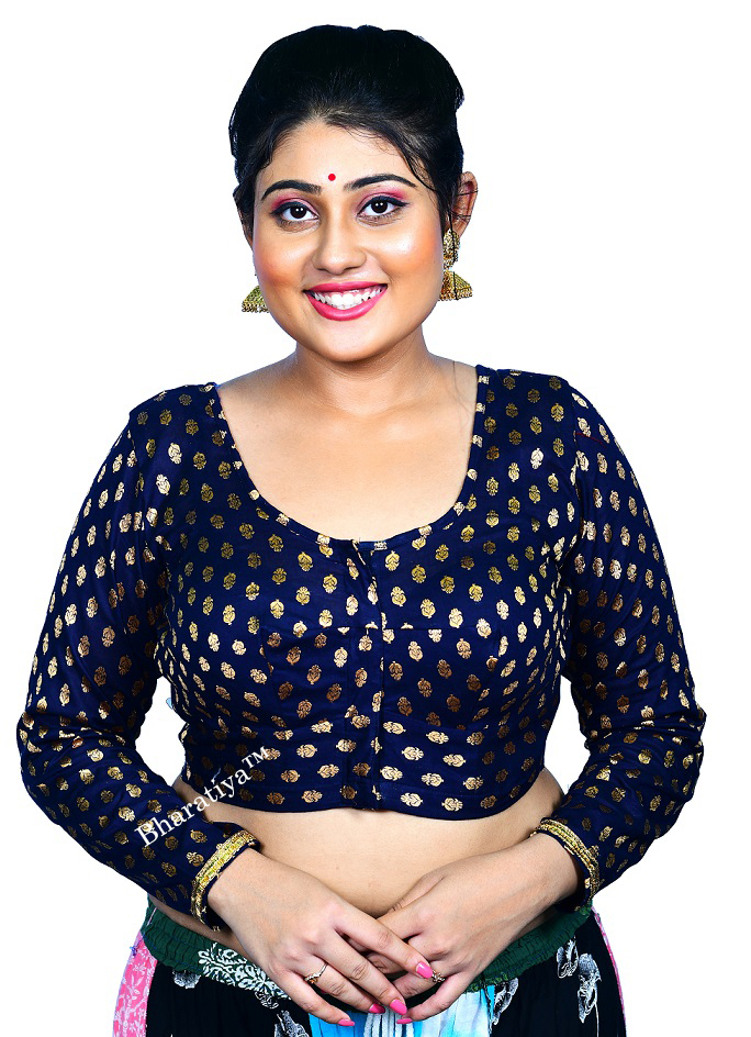 Bharatiya™ Premium Cotton Brocade Full Sleeve Indian Style Blouse (Size 34 to 56) | Navy Blue