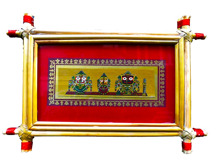 Bharatiya handcrafted Palm-leaf Painting – a priceless piece of your ancient heritage, with cane stick borders & Glass covered | Wall Painting | Home Decor (27 X 14 Cm) (Jagannath Subhadra Balaram)